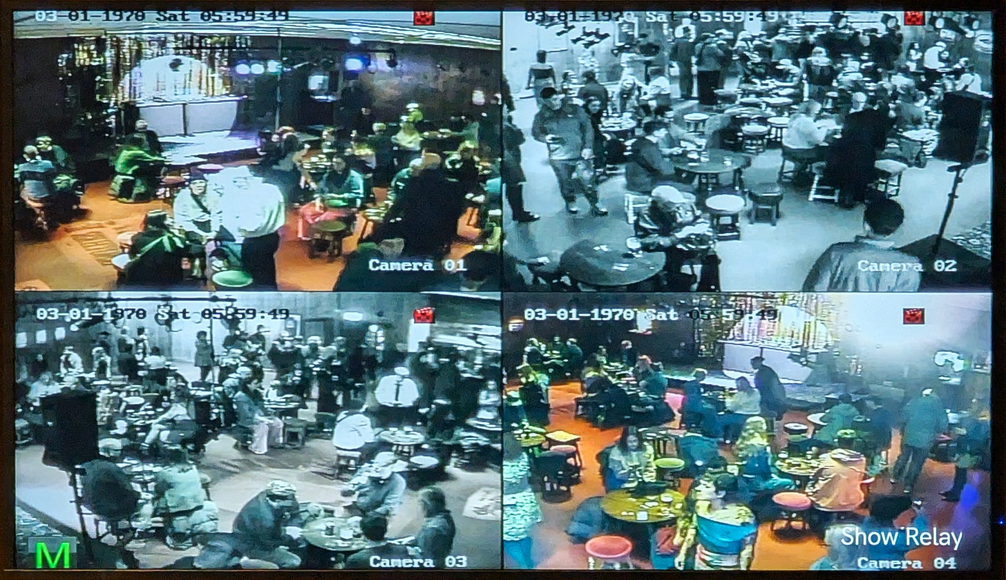 Before you reached the bar, you were shown the bar. A monitor downstairs ran live CCTV from the pub upstairs. You stood in line watching drinkers on a split-screen feed. Through surveillance the room was visible before it was accessible. It could be simple crowd management, but it read as staging: surveillance as the first threshold.