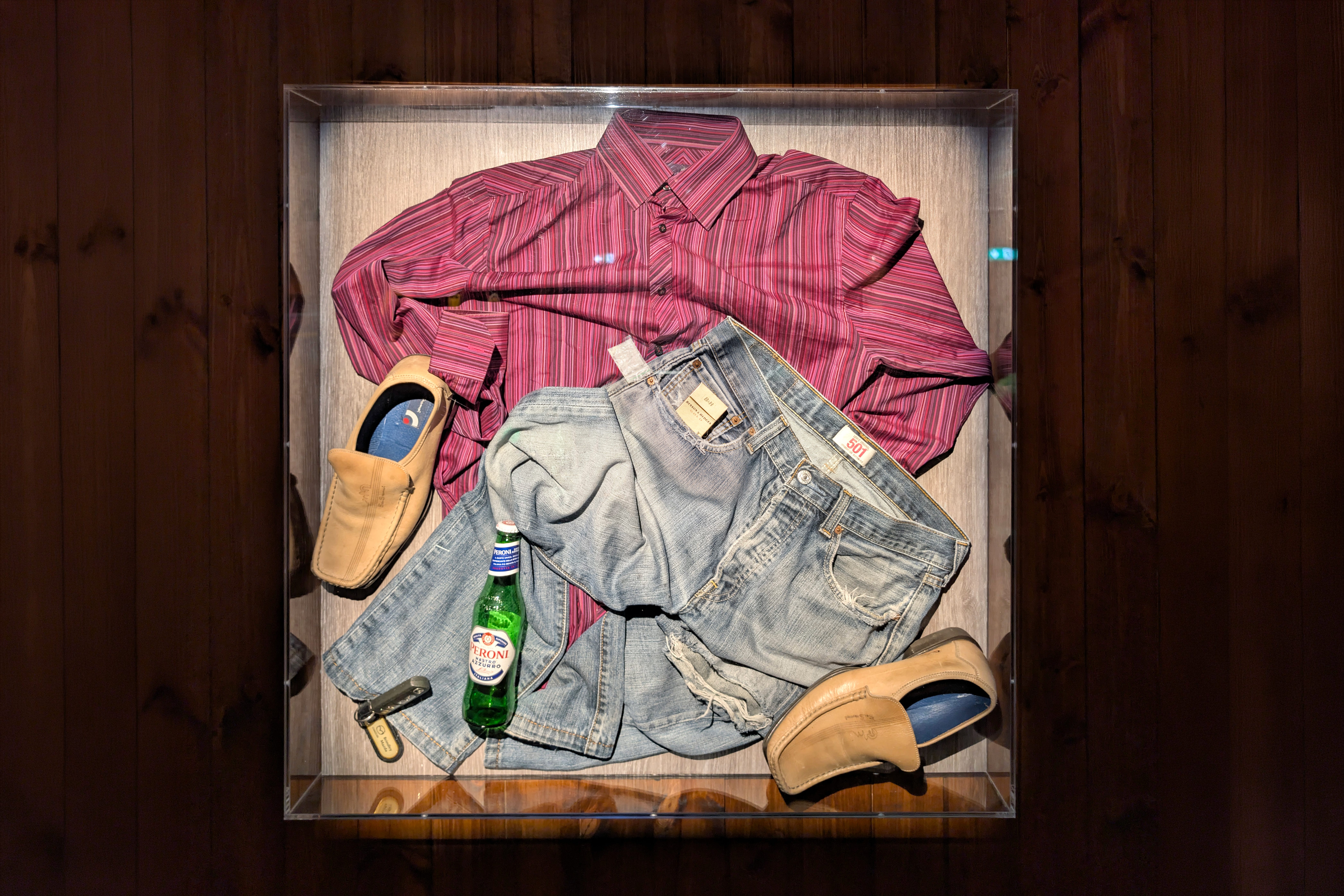 The point is legibility. You look like you know how to behave. But the small plastic packet in the centre of the work exposes the weakness of that system. Dress codes sorted bodies by what could be seen; they could not sort what was carried. As long as the clothes read correctly, the body passed. Menswear filtered appearances, not behaviour.
